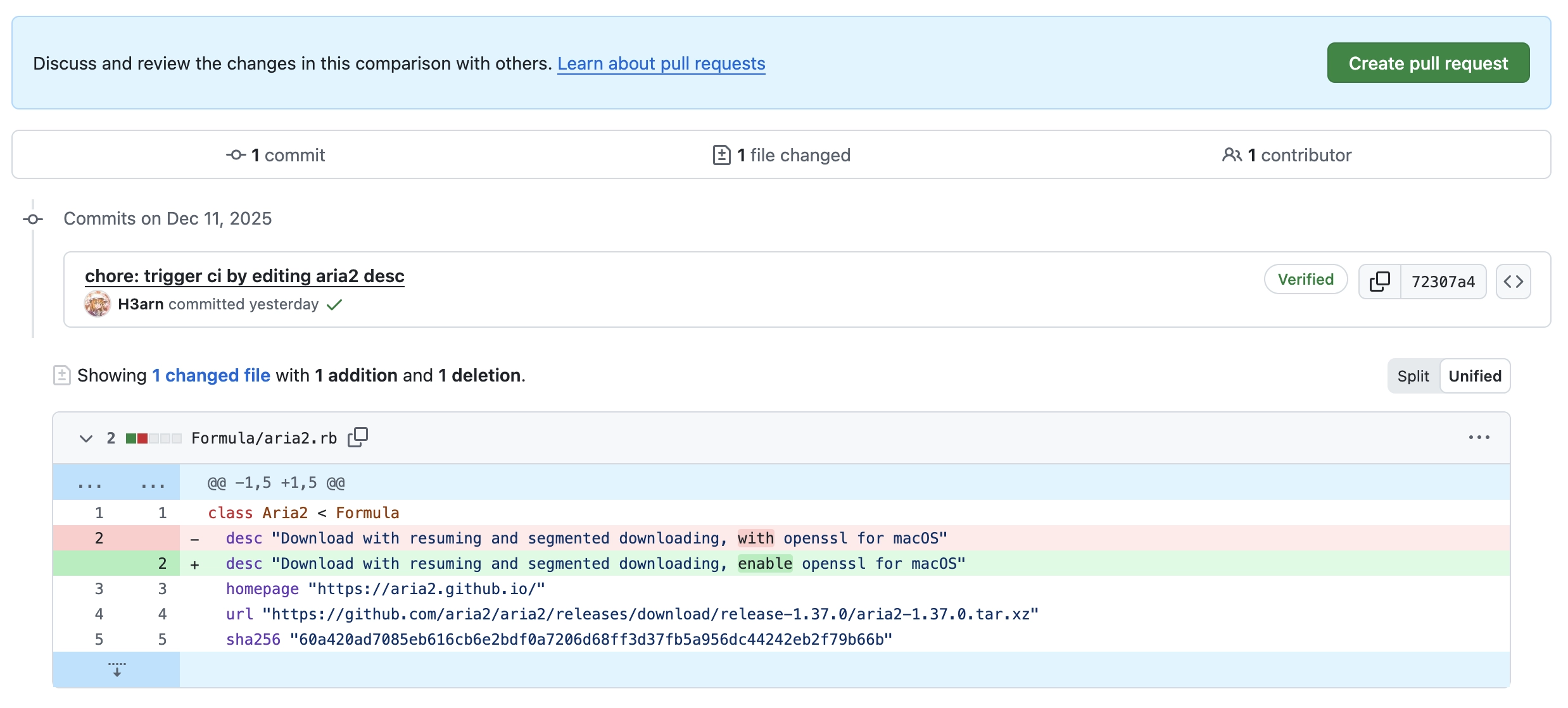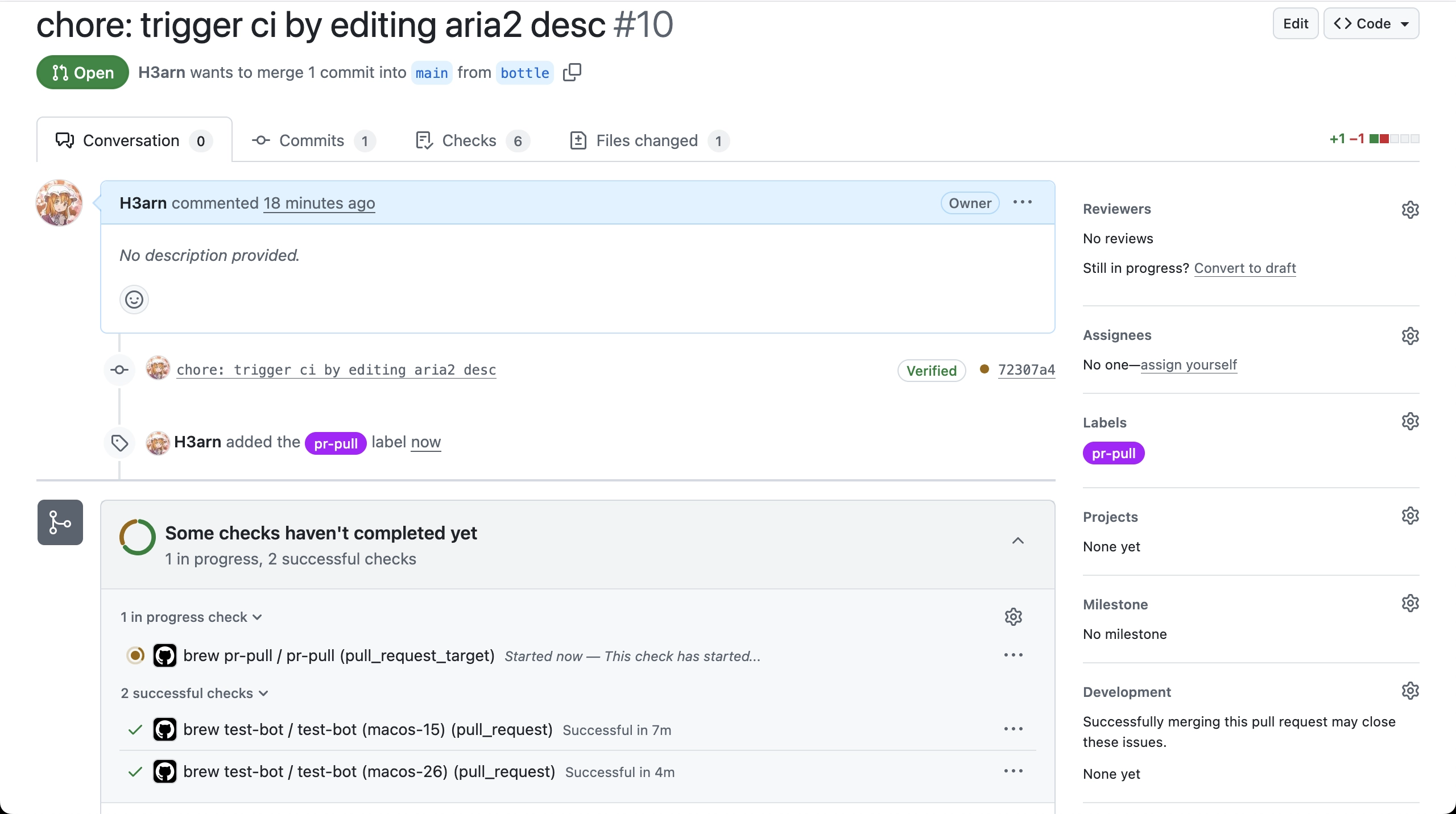 不巧的是,这个时候 Formula 的更改已经送上去很久了,而在 brew test-bot --only-formulae 会检测 Formula 更改,没有的话是不会触发 bottle 构建的,只好补充一下 desc 来触发了